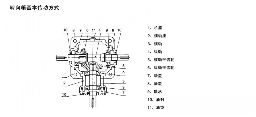 T系列齒輪轉(zhuǎn)向箱,轉(zhuǎn)向齒輪箱的構(gòu)成部分主要有機(jī)座、橫軸座、橫軸、縱軸、橫軸錐齒輪、縱軸錐齒輪、端蓋、軸承、油封、油鏡等(見下圖)。